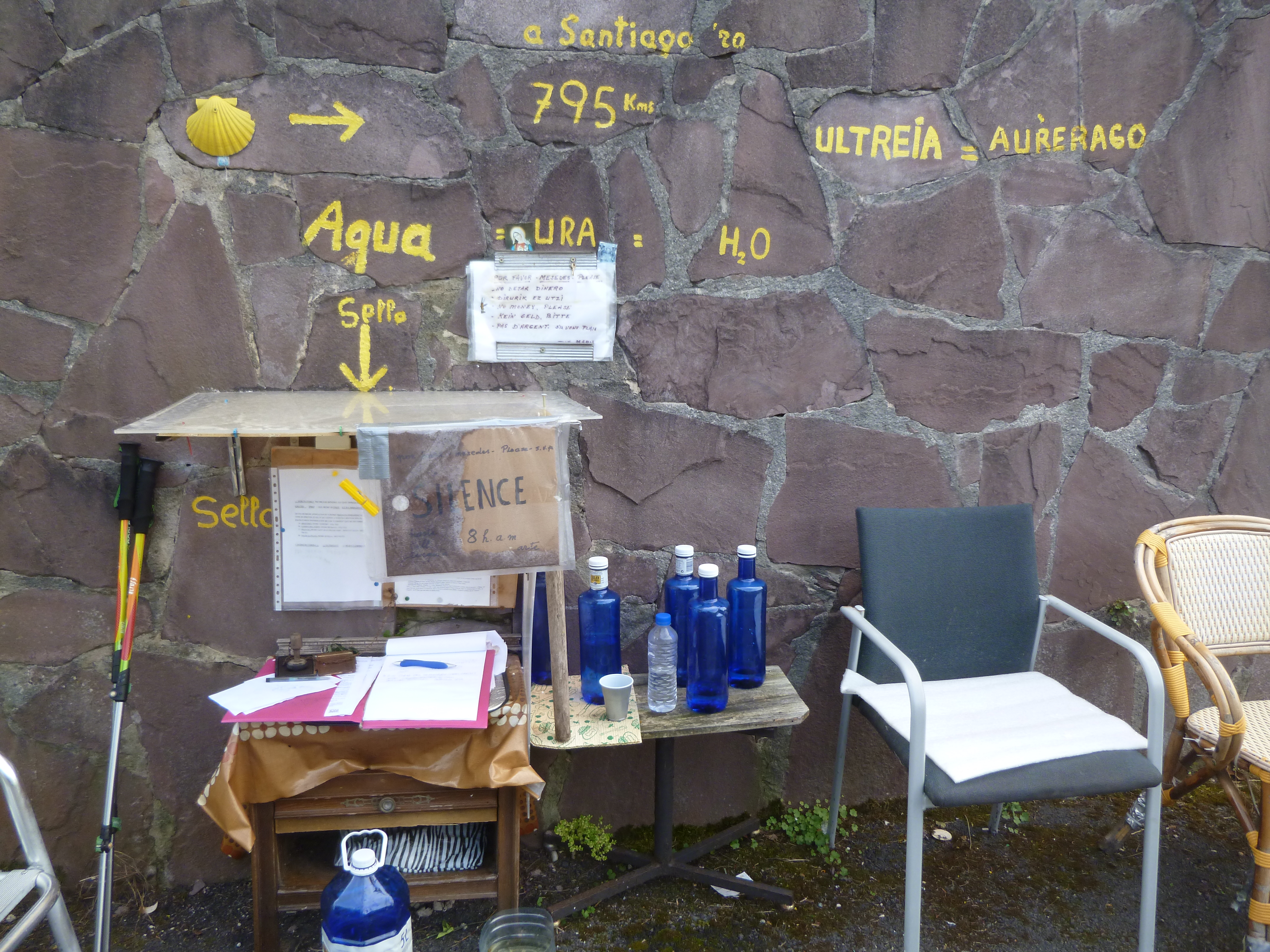 The day is about 20 degrees cooler than the past two days, and that is a great relief, but by the time one goes over the mountain, it seems nearly as hot. I stop once to put on my knee brace, again to fill a water bottle, again to order juice from a hotel at the top of the hill. Soon I pass what I’ve come to call a “generosity stop”.  Someone who loves pilgrims has created a sort of rest stop for anyone who needs it. You can even get your credenciale stamped.