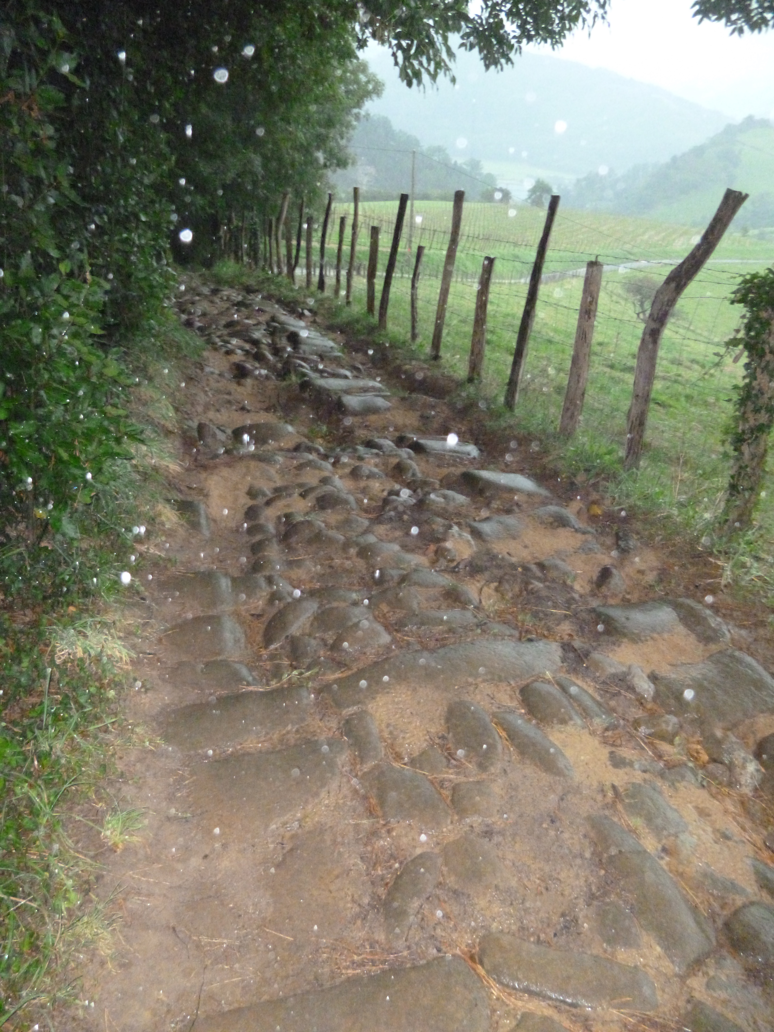 Do I take out my poncho yet or not?  Not.  But soon.  And I am happy that “soon” I do cover myself. By the time the thunder had had its say for 45 minutes, the sky opens up and I, gratefully covered in my new pack poncho, feel as though I have stepped into a sauna. This cold-seeking pilgrim cannot seem to escape the heat in any form. But the poncho is much more effective than the rain jacket I lost the first day on the Camino Frances. Covers me and my pack, down past my knees.