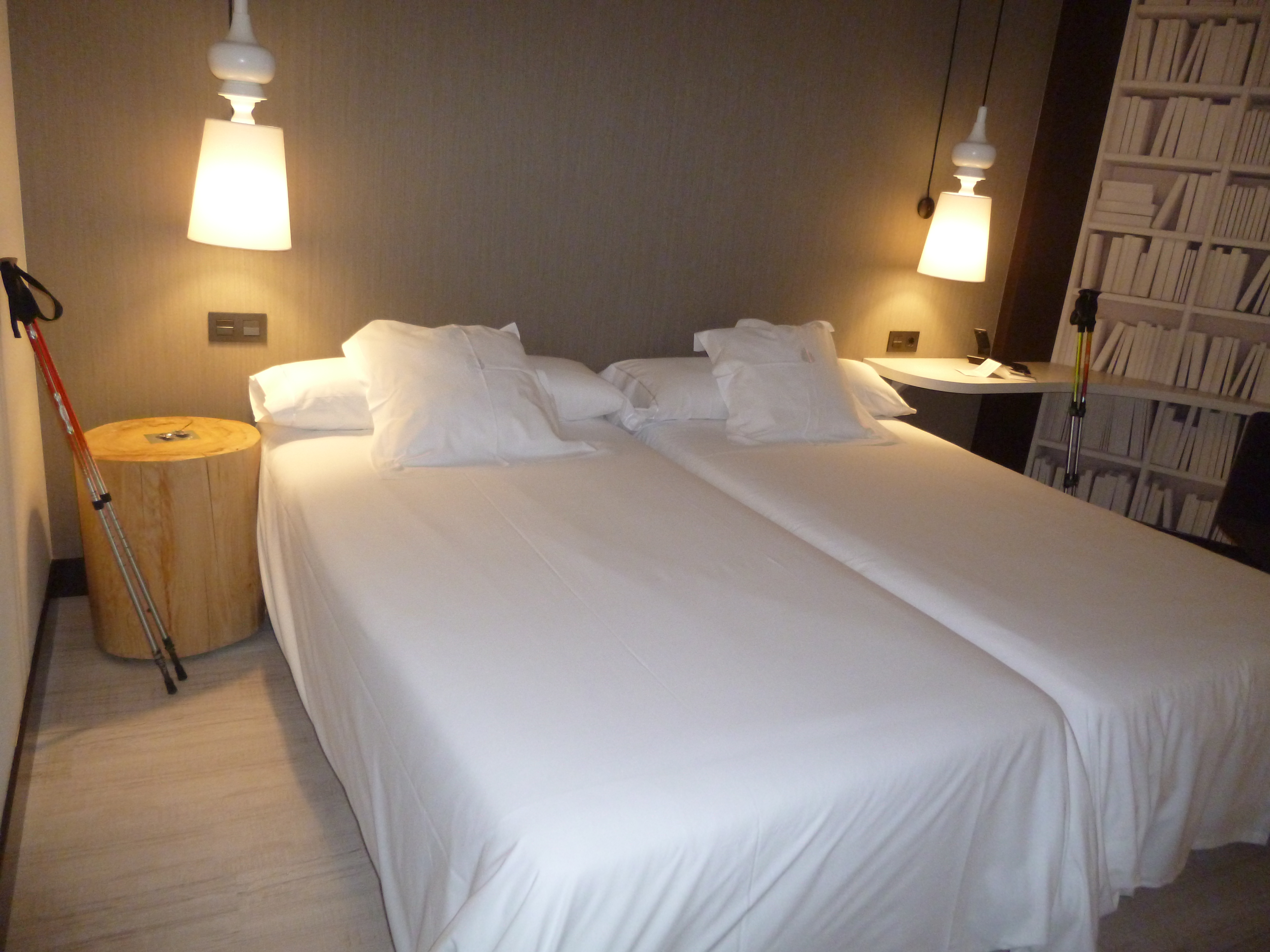 Here is our sweet, perfect white hotel room, before we settle in, then with the hats, and then the packs. I won’t show photos of what it looks like during the weekend. We are both “organizing”.